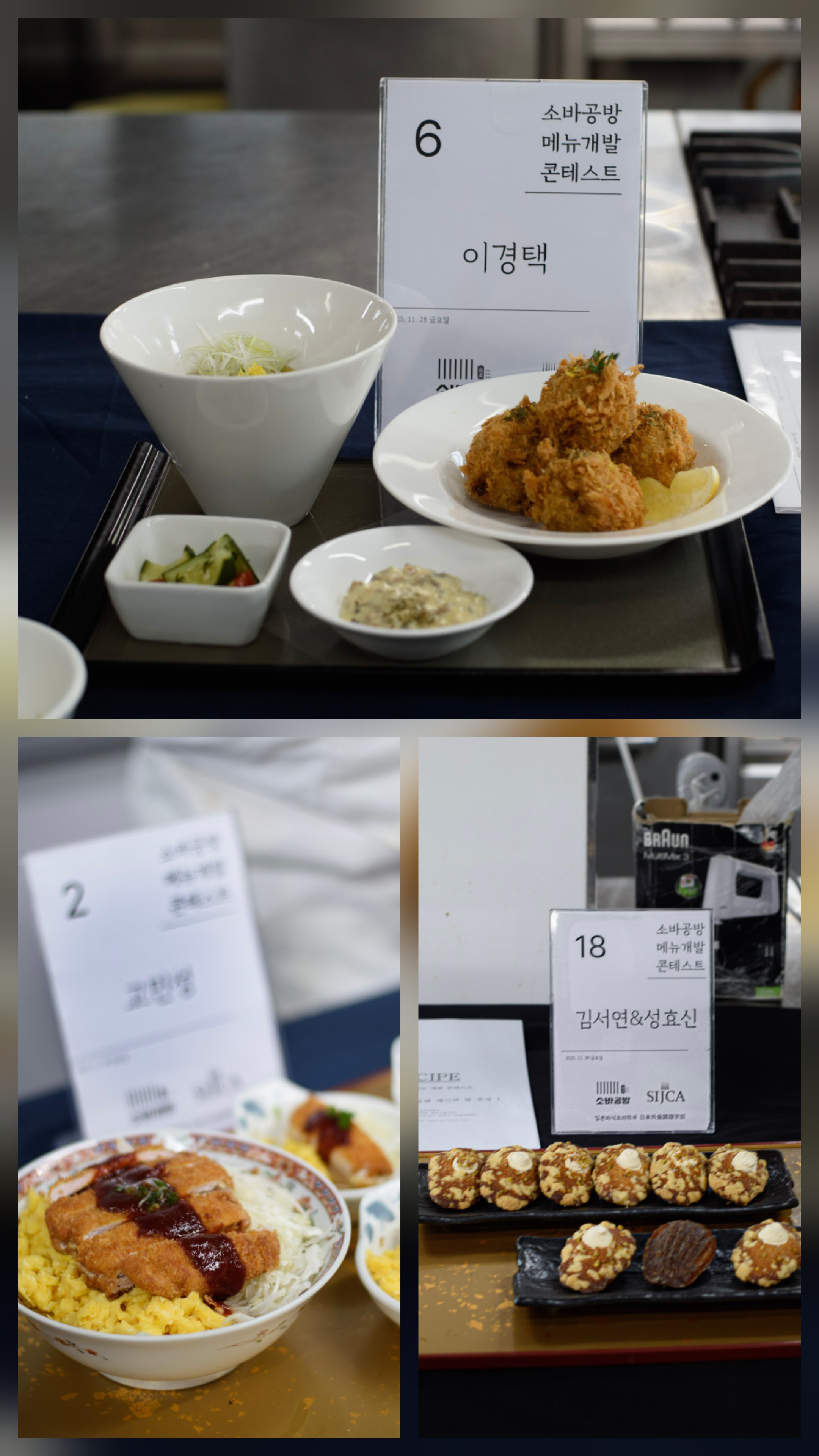 조리전공측은 창작 메밀소바와 돈카츠를 이용한 메뉴, 제과제빵전공측은 메밀가루를 이용한 다양한 디저트를 주제로 대회가 열렸습니다.